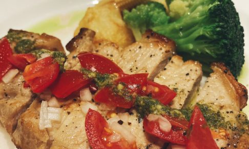 今週のシェフランチ(週替り)はポークステーキ フレッシュトマトソースです。 味の濃いミニトマトで作った新鮮なフレッシュトマトソースと、ポークステーキのあっさりとした、この時期にぴったりのメニューです。