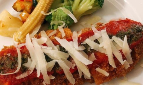 今週のシェフランチ(週替り)はミラノ風チキンカツレツです。 鶏むね肉にチーズを挟んでからフライにして、トマトソース、バジルソース、削りチーズで仕上げています。 シェフも大好きなメニューです。