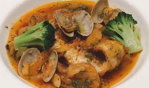 今週のシェフランチ(週替り)は赤魚のカチャトラーナです。 赤魚とアサリを白ワインで蒸し焼きにして、トマトソースとバジルソースで味を整えました。